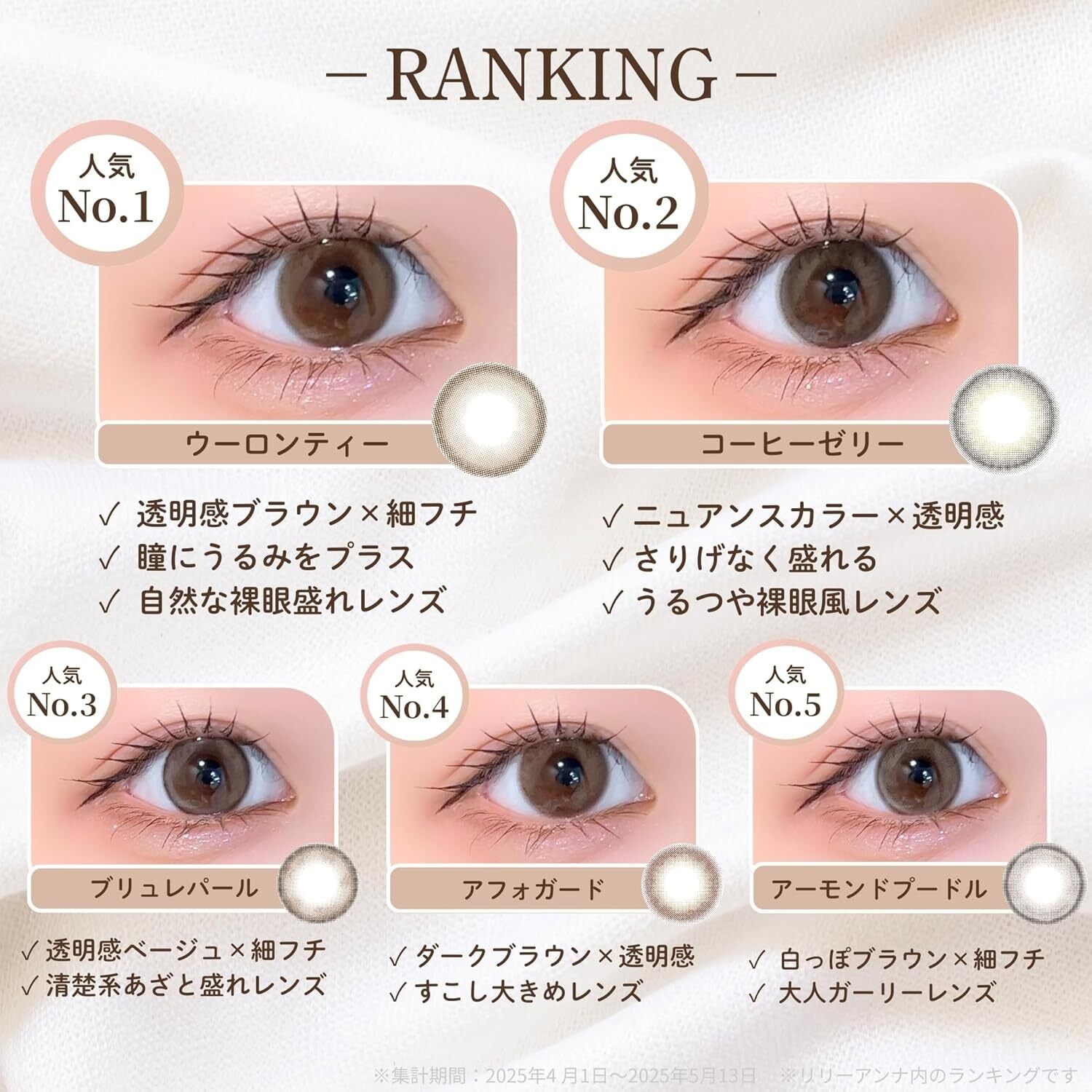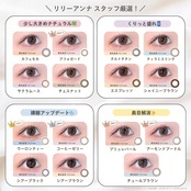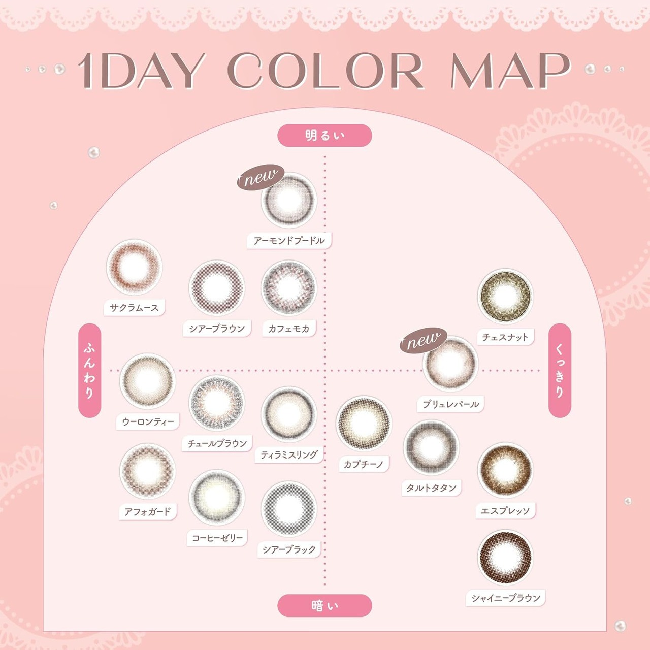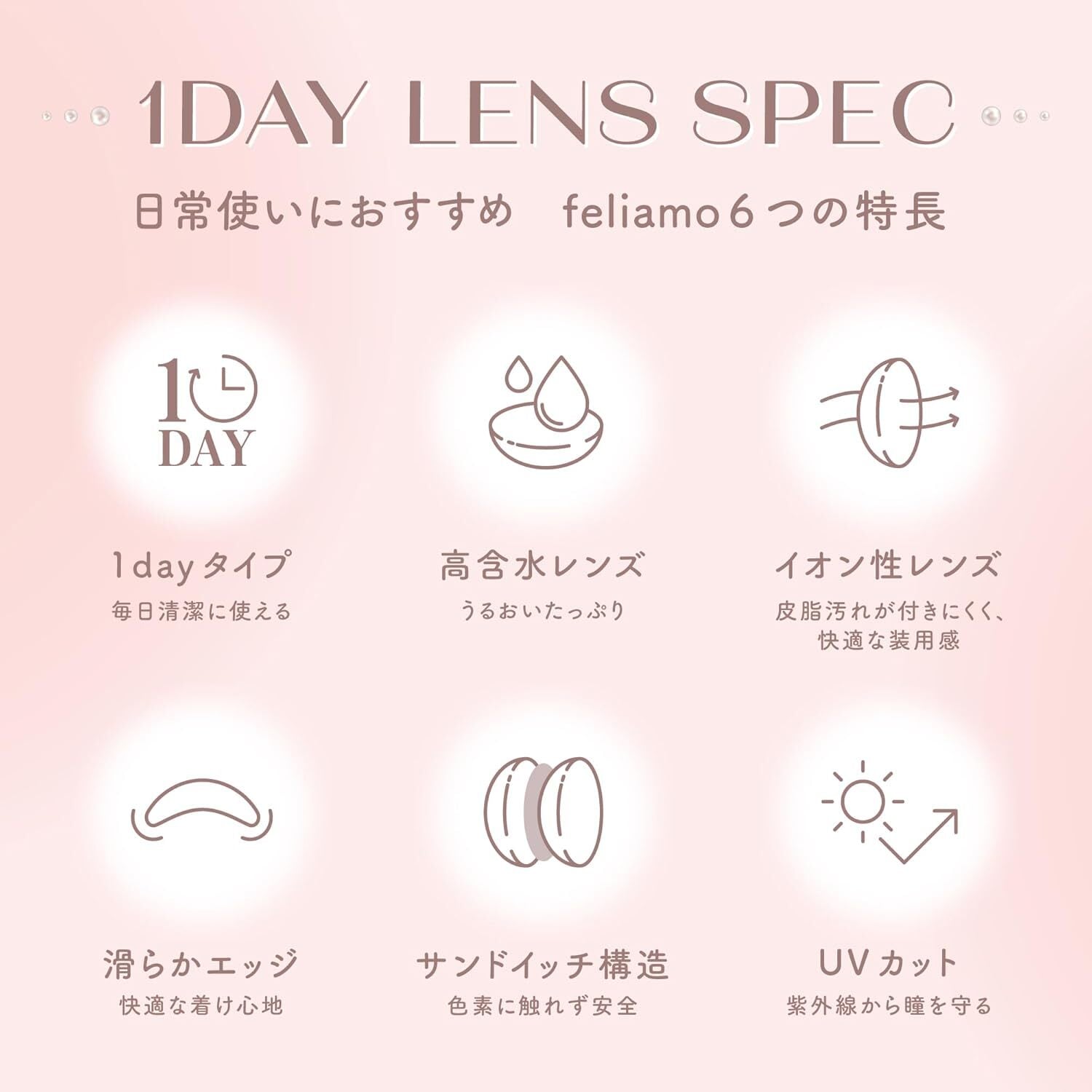 [LENS FEATURE]【UVカット】肌や瞳に有害といわれ、白内障などの眼病を引き起こす危険性のある紫外線をカット【イオン性】水分を多く含み酸素を通しやすいため瞳への負担が少なく、快適な装用感【高含水】水分を多く含むやわらかい素材で、瞳に違和感なく快適なつけ心地【レンズ構造】サンドイッチ構造のため、角膜に色素が触れない【レンズ形状】フチを丸みのある形状にすることで自然な装用感を実現