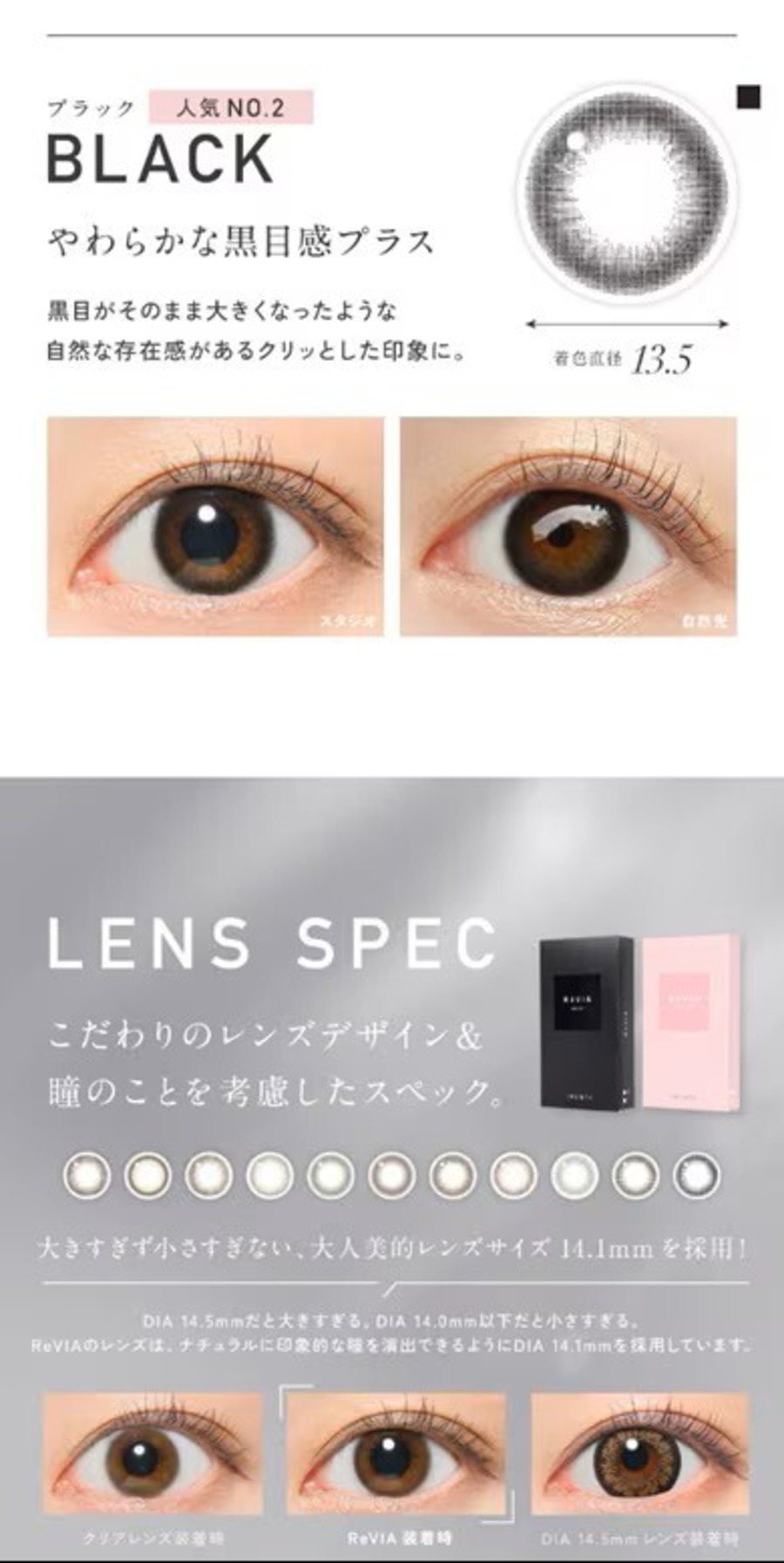 ReVIA 1month COLORの開発には、多くの時間と努力が注がれました。安全性と快適性を追求し、優れた材料を使用しています。瞳への優しさを考えて、直径14.2mmという自然なサイズを選びました。装着感が心地よく、長時間の使用でも疲れにくいので、普段使いに最適です。